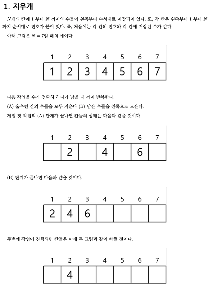 위 문제는 배열을 칸을 나눠서 홀수 칸의 숫자를 지우고, 남은 배열 원소를 왼쪽으로 미는 과정을 반복해서 마지막 남은 수를 구하는 문제이다.