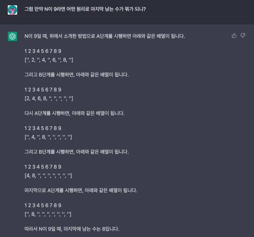 문제 설명이 굉장히 어려웠는데 chatgpt가 이해했다고 해서 확인할 겸 n이 9일 경우 무슨 수가 남는지 원리를 보여주면서 설명하라고 했다.